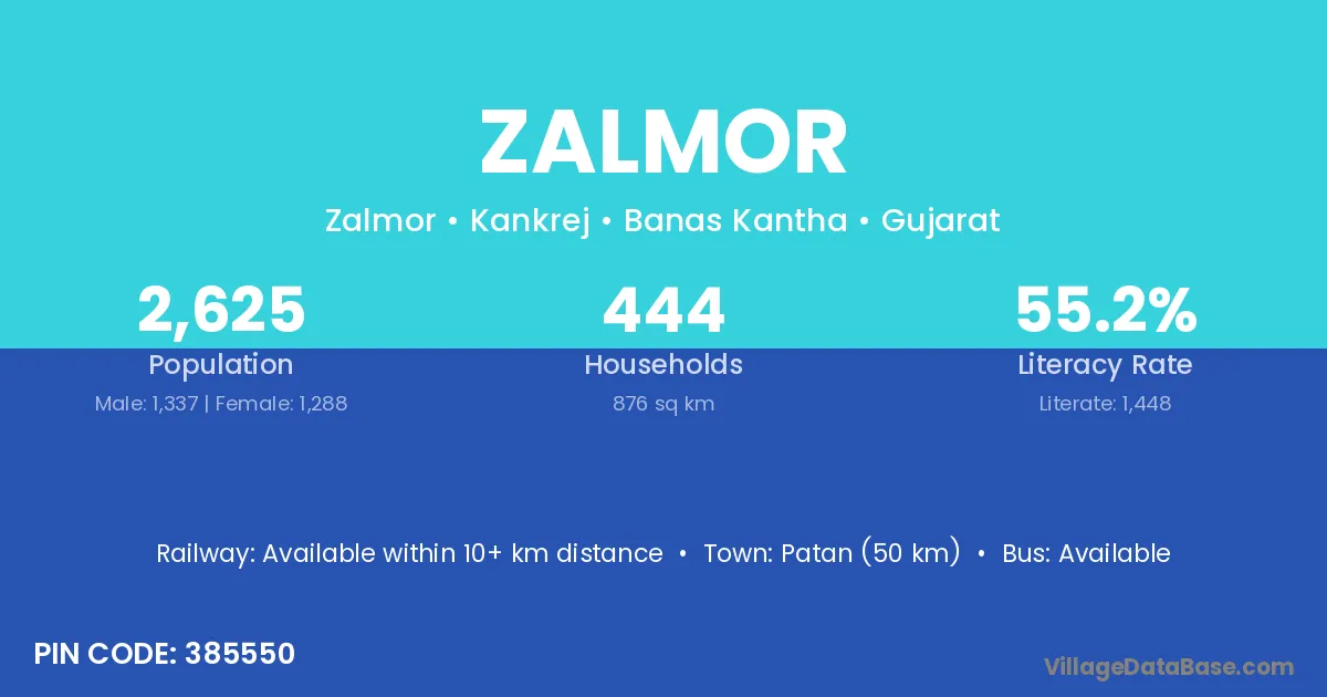 Patan (50 km) is the nearest town to Zalmor village for major economic activities and is located approximately 50 km away.