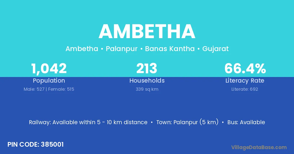 Palanpur (5 km) is the nearest town to Ambetha village for major economic activities and is located approximately 5 km away.