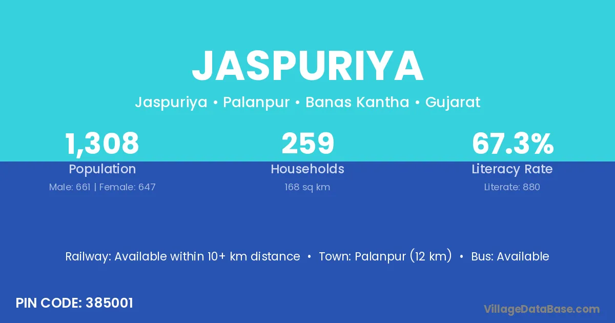 Palanpur (12 km) is the nearest town to Jaspuriya village for major economic activities and is located approximately 12 km away.