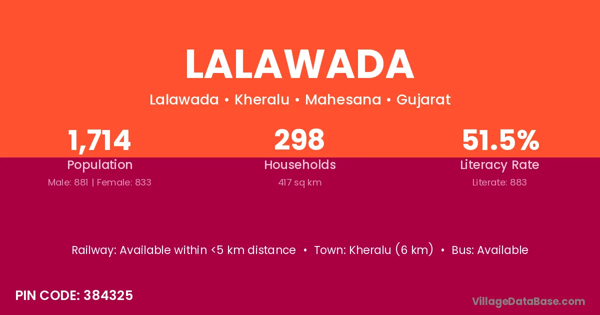 According to Census 2011 information, the village code of Lalawada village is 385001.