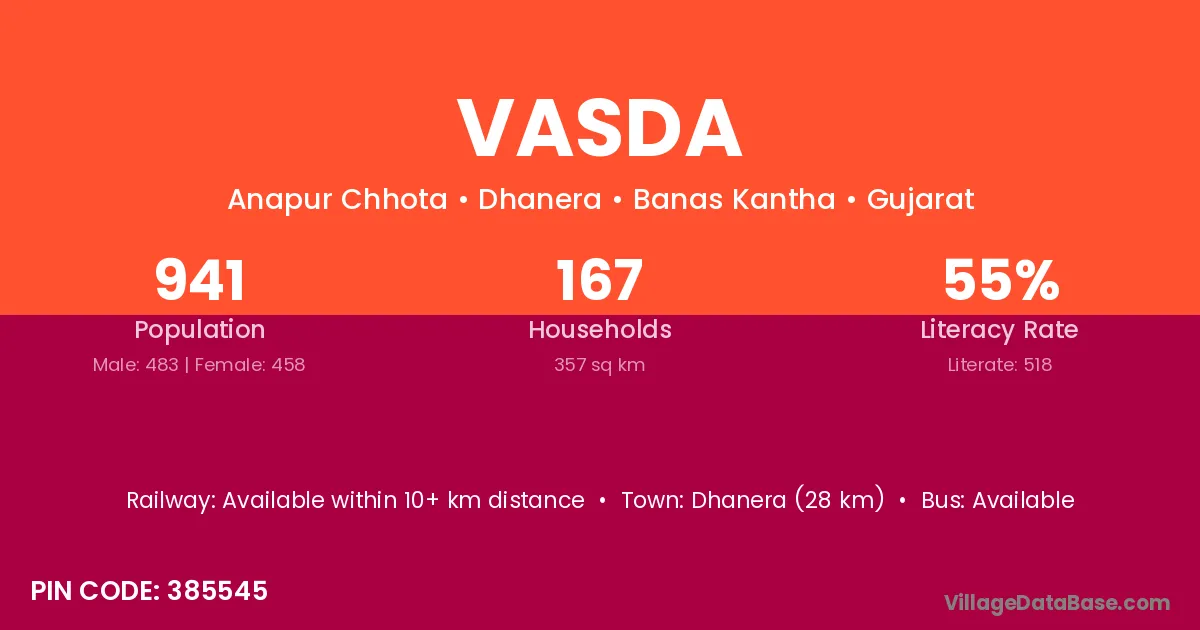Palanpur (6 km) is the nearest town to Vasda village for major economic activities and is located approximately 6 km away.
