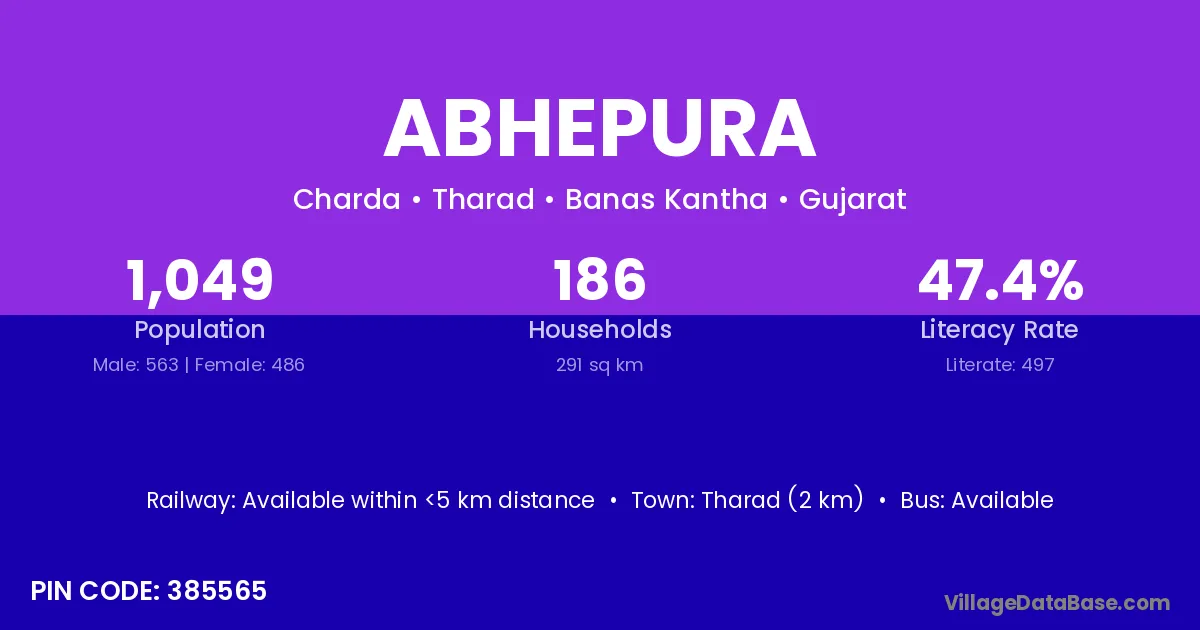 Tharad (2 km) is the nearest town to Abhepura village for major economic activities and is located approximately 2 km away.