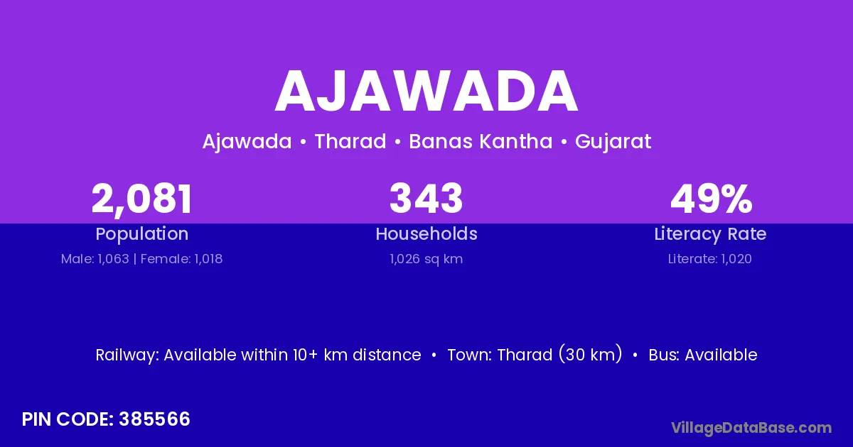 Tharad (30 km) is the nearest town to Ajawada village for major economic activities and is located approximately 30 km away.
