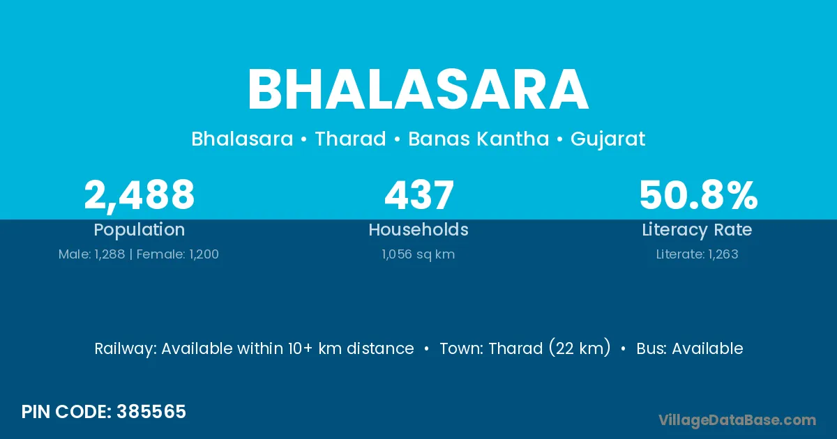 Tharad (22 km) is the nearest town to Bhalasara village for major economic activities and is located approximately 22 km away.
