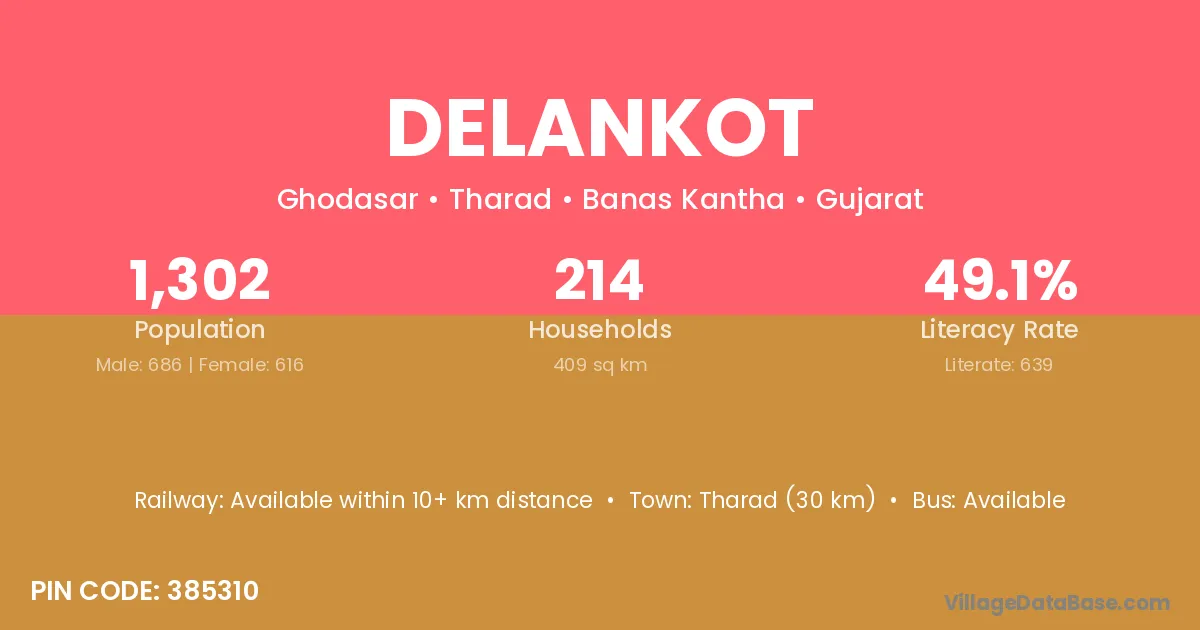 Tharad (30 km) is the nearest town to Delankot village for major economic activities and is located approximately 30 km away.