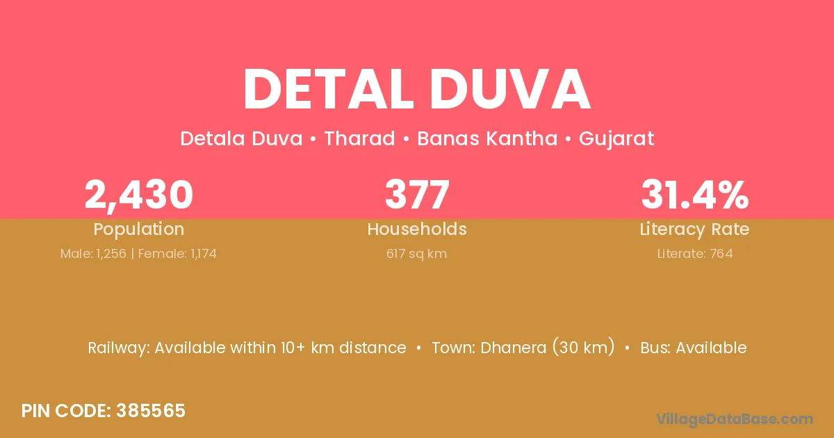 Dhanera (30 km) is the nearest town to Detal Duva village for major economic activities and is located approximately 30 km away.