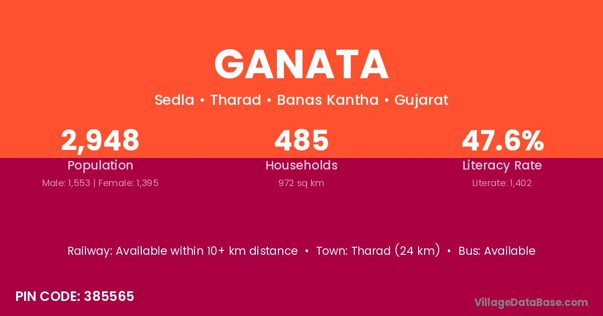 Tharad (24 km) is the nearest town to Ganata village for major economic activities and is located approximately 24 km away.
