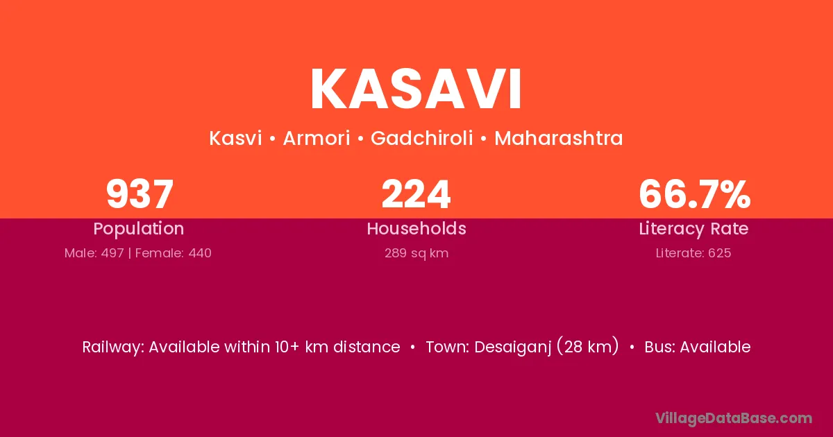 The literacy rate of Kasavi village is 54.28%. Male literacy stands at 65.97% and female literacy at 40.76%.