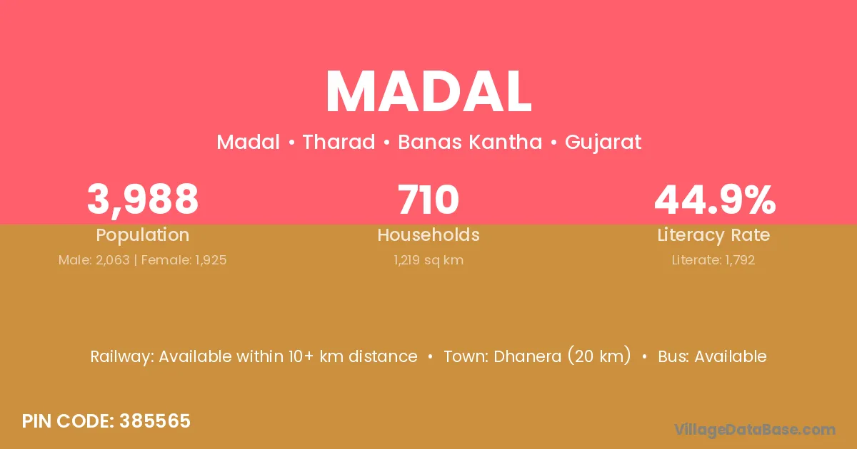 Dhanera (20 km) is the nearest town to Madal village for major economic activities and is located approximately 20 km away.