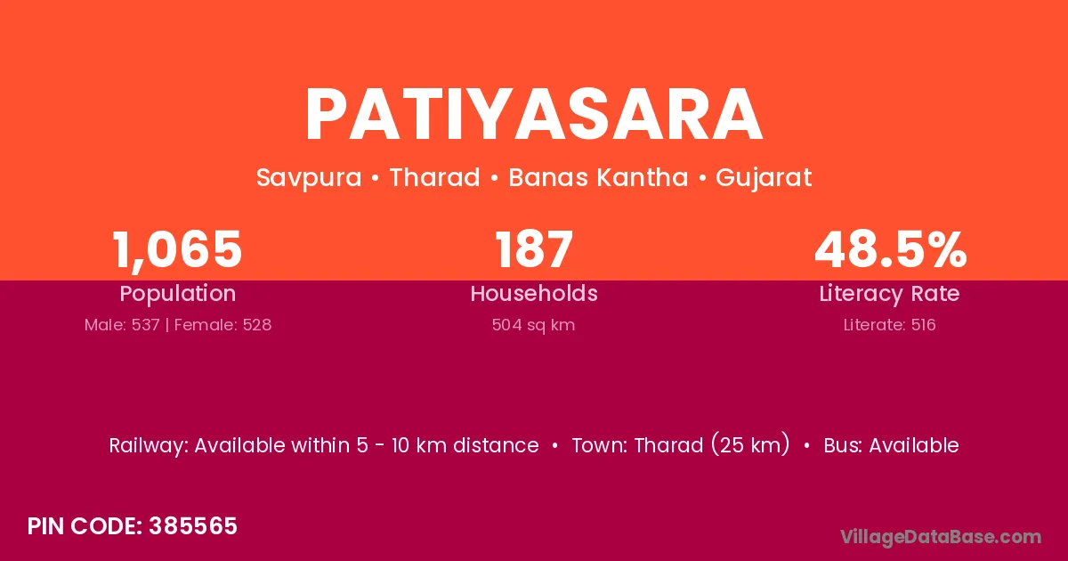 Tharad (25 km) is the nearest town to Patiyasara village for major economic activities and is located approximately 25 km away.