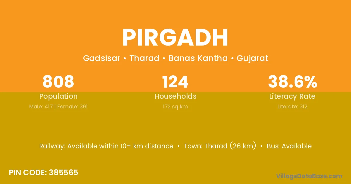 Tharad (26 km) is the nearest town to Pirgadh village for major economic activities and is located approximately 26 km away.