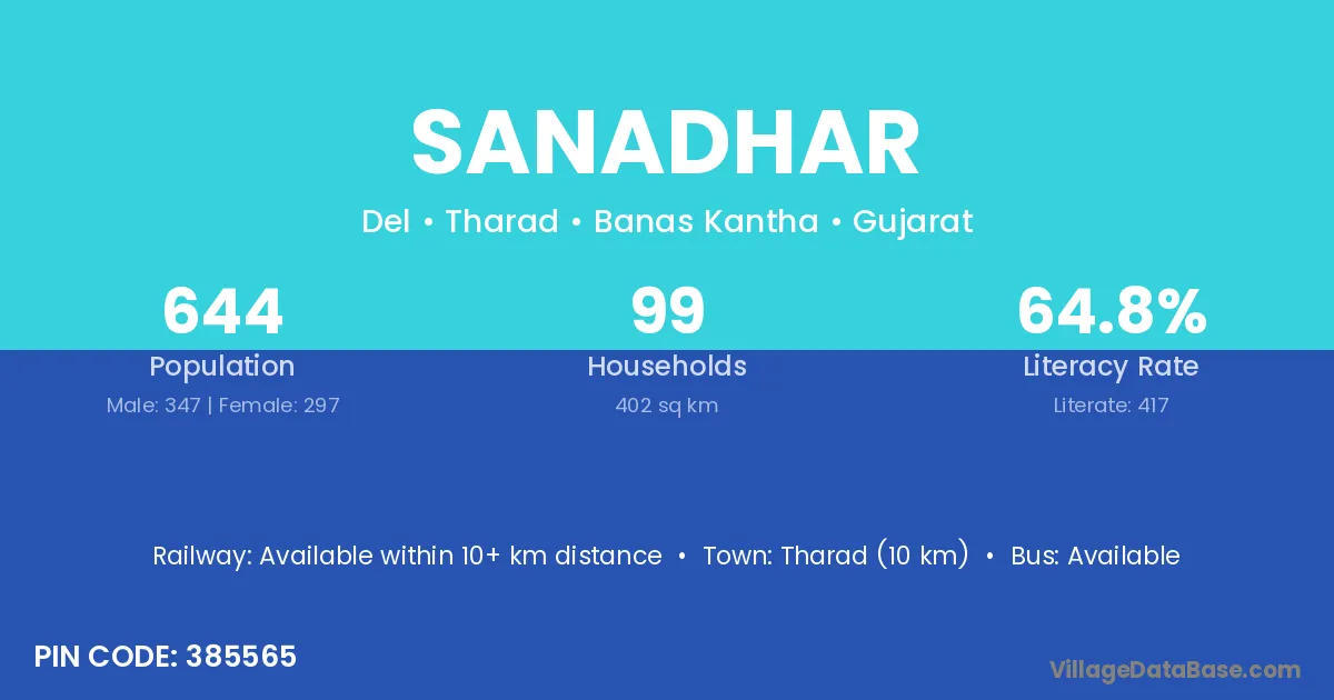 Tharad (10 km) is the nearest town to Sanadhar village for major economic activities and is located approximately 10 km away.