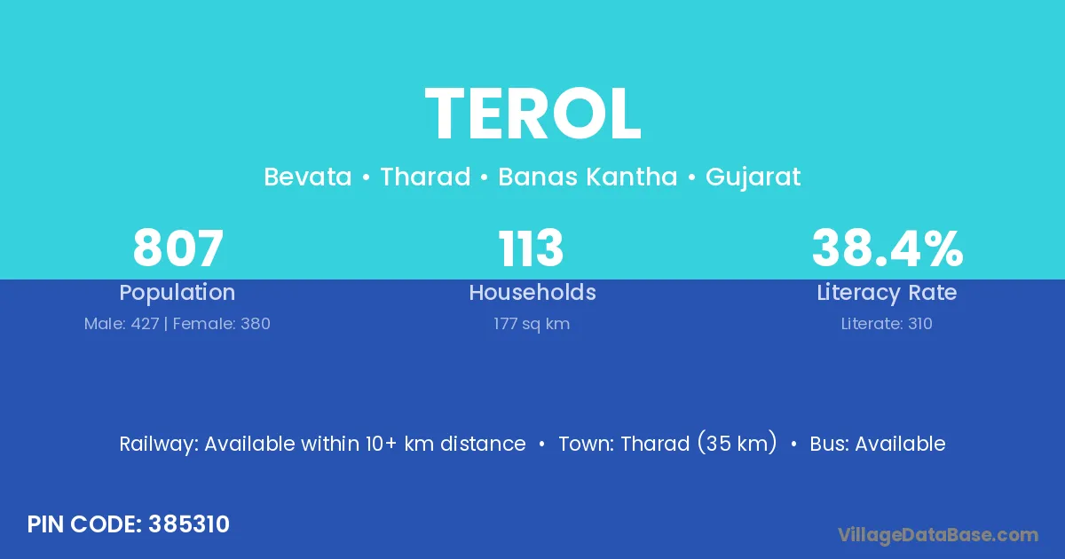 Tharad (35 km) is the nearest town to Terol village for major economic activities and is located approximately 35 km away.