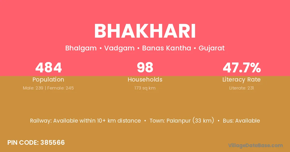 Palanpur (33 km) is the nearest town to Bhakhari village for major economic activities and is located approximately 33 km away.