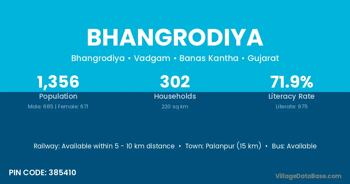 Palanpur (15 km) is the nearest town to Bhangrodiya village for major economic activities and is located approximately 15 km away.