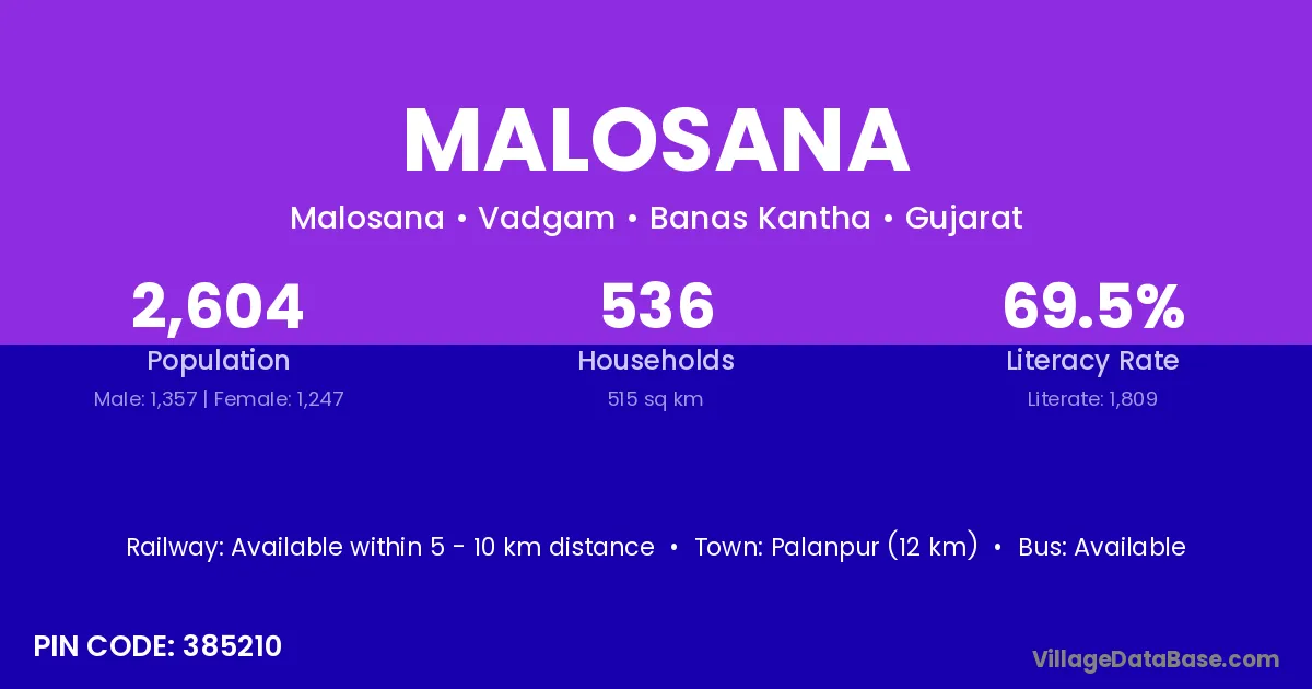 Palanpur (12 km) is the nearest town to Malosana village for major economic activities and is located approximately 12 km away.