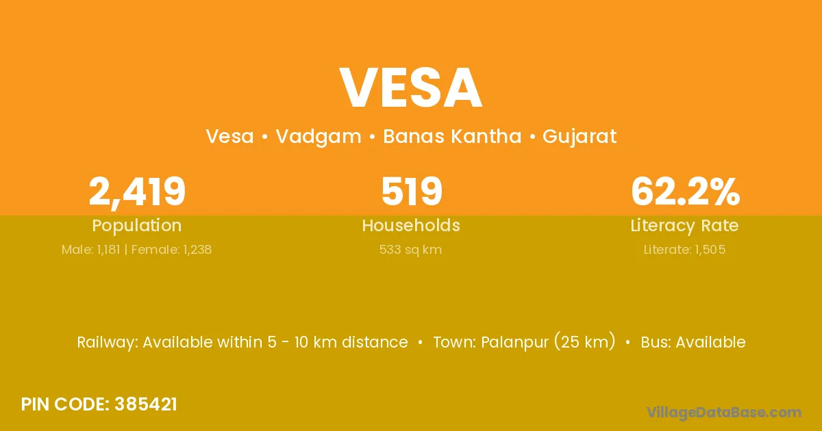 Palanpur (25 km) is the nearest town to Vesa village for major economic activities and is located approximately 25 km away.