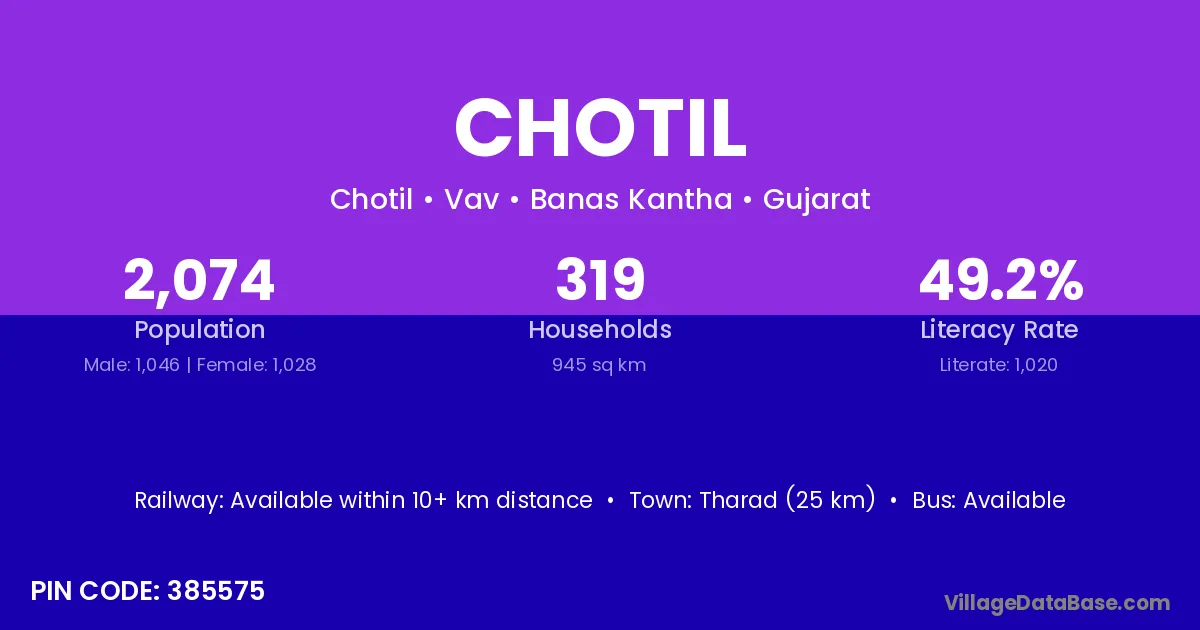 Tharad (25 km) is the nearest town to Chotil village for major economic activities and is located approximately 25 km away.