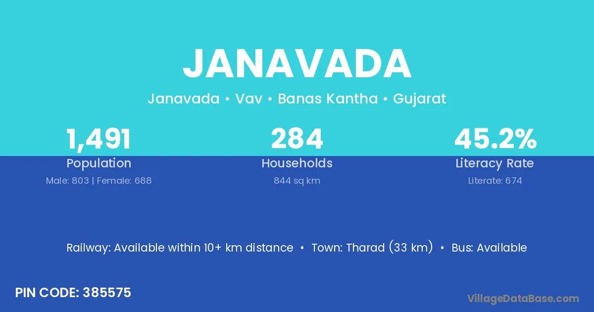 Tharad (33 km) is the nearest town to Janavada village for major economic activities and is located approximately 33 km away.