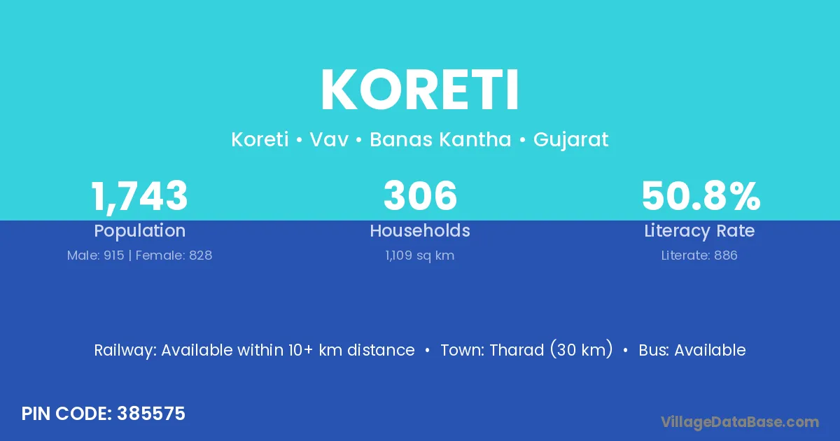 Tharad (30 km) is the nearest town to Koreti village for major economic activities and is located approximately 30 km away.