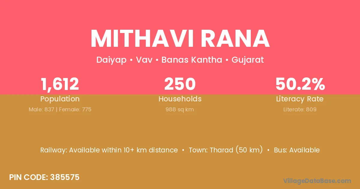 Tharad (50 km) is the nearest town to Mithavi Rana village for major economic activities and is located approximately 50 km away.