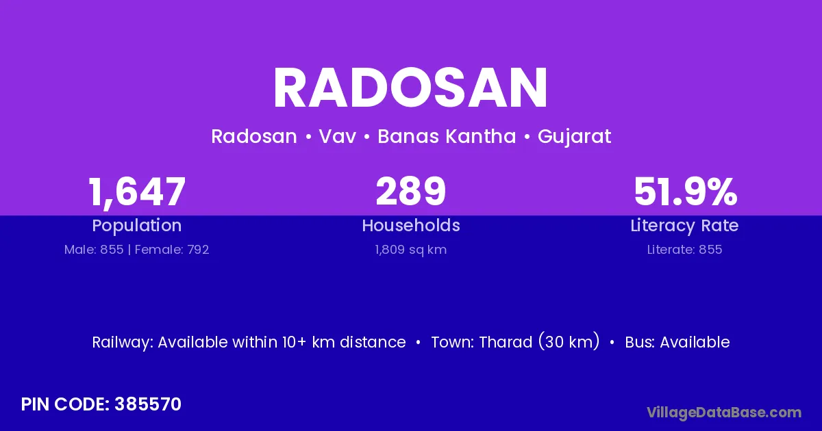 Tharad (30 km) is the nearest town to Radosan village for major economic activities and is located approximately 30 km away.