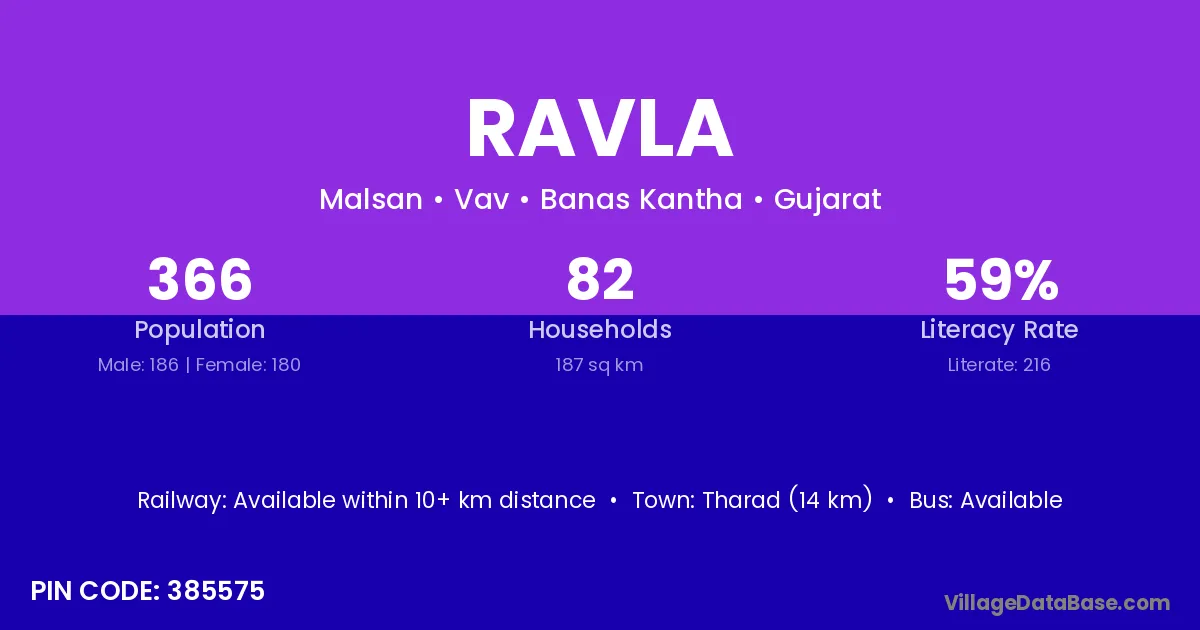 Tharad (14 km) is the nearest town to Ravla village for major economic activities and is located approximately 14 km away.