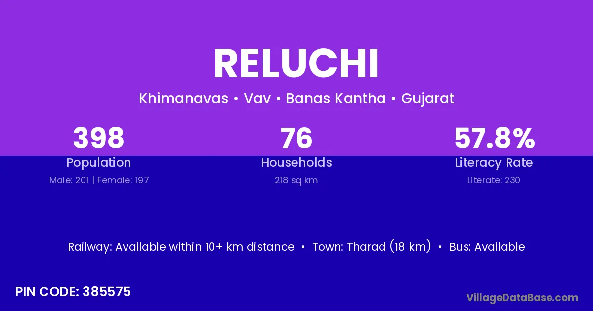 Tharad (18 km) is the nearest town to Reluchi village for major economic activities and is located approximately 18 km away.