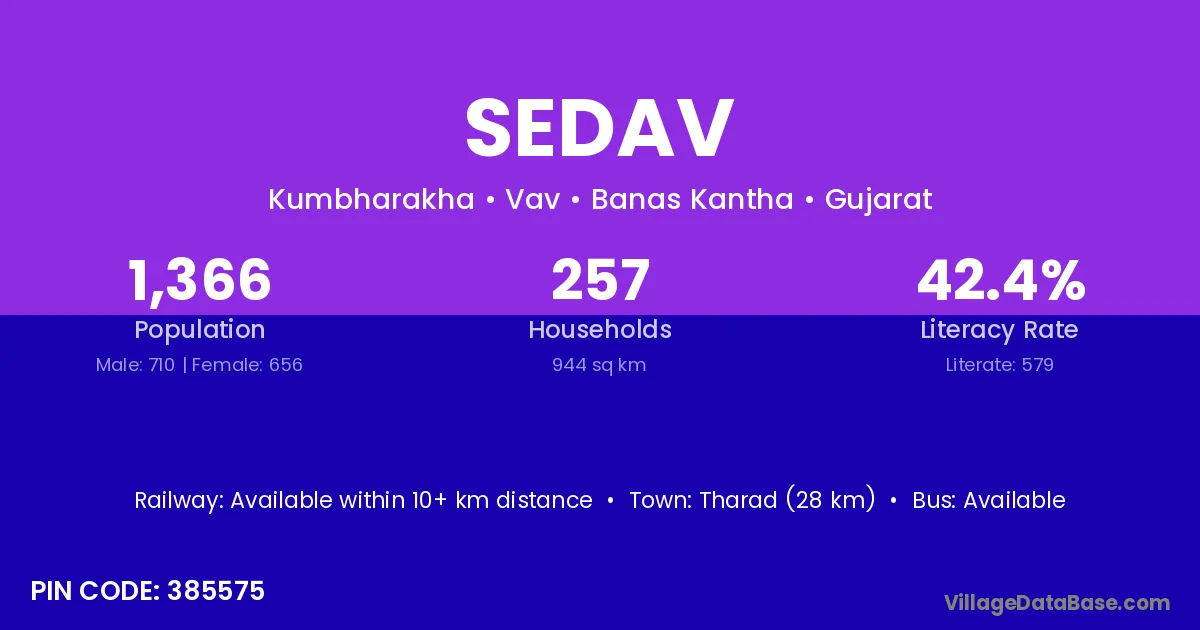 Tharad (28 km) is the nearest town to Sedav village for major economic activities and is located approximately 28 km away.