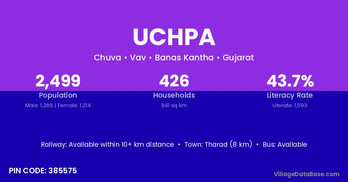 Tharad (8 km) is the nearest town to Uchpa village for major economic activities and is located approximately 8 km away.
