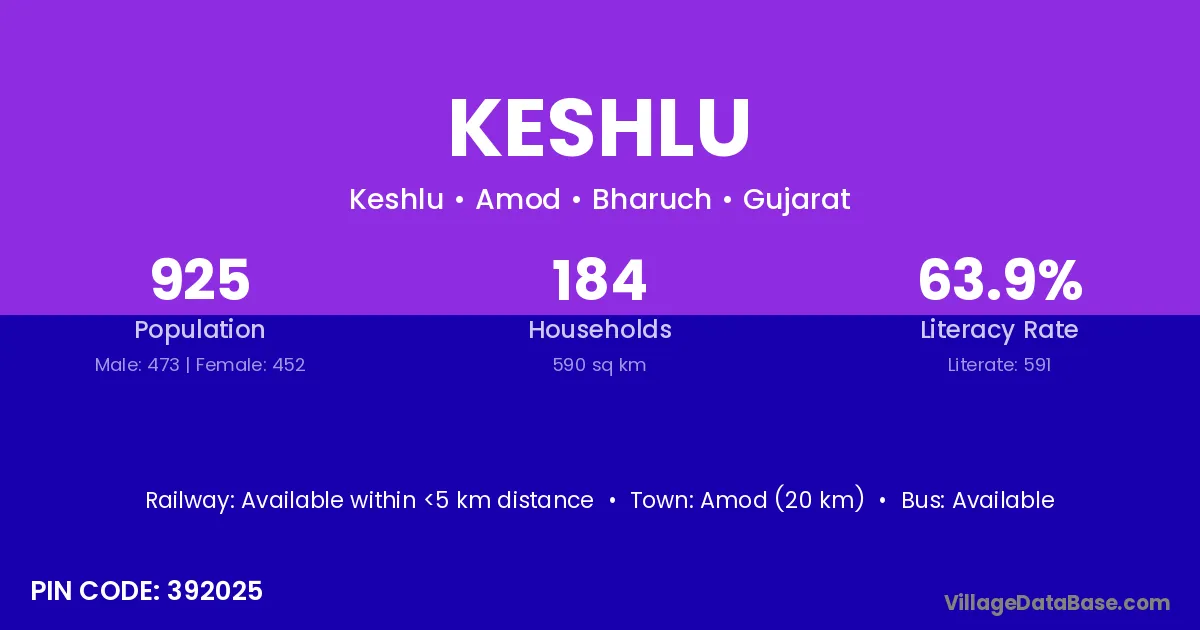 Amod (20 km) is the nearest town to Keshlu village for major economic activities and is located approximately 20 km away.