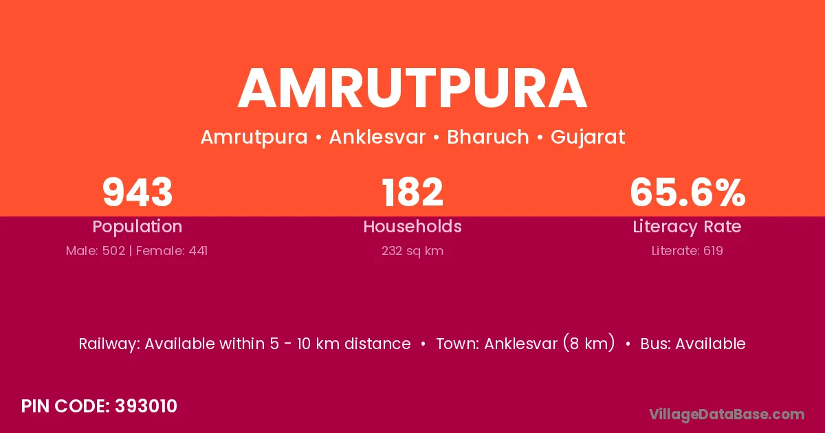 Anklesvar (8 km) is the nearest town to Amrutpura village for major economic activities and is located approximately 8 km away.