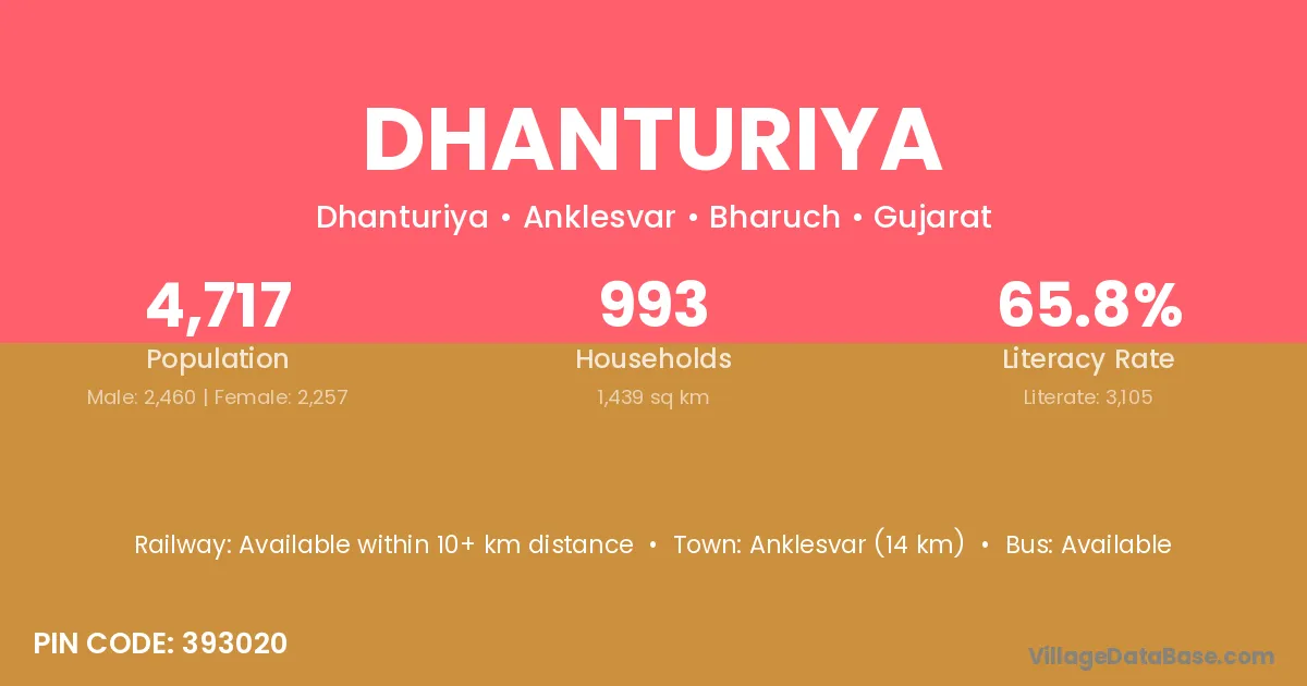 Anklesvar (14 km) is the nearest town to Dhanturiya village for major economic activities and is located approximately 14 km away.