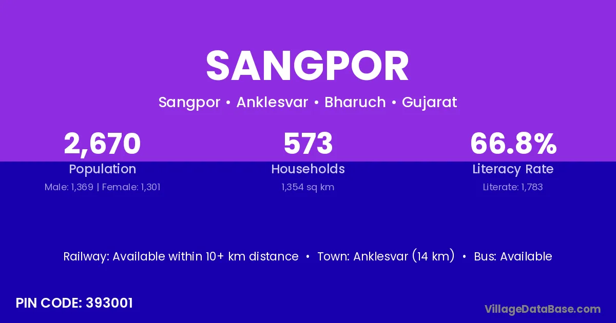 Anklesvar (14 km) is the nearest town to Sangpor village for major economic activities and is located approximately 14 km away.