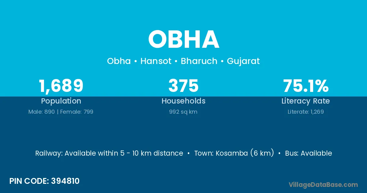 Kosamba (6 km) is the nearest town to Obha village for major economic activities and is located approximately 6 km away.