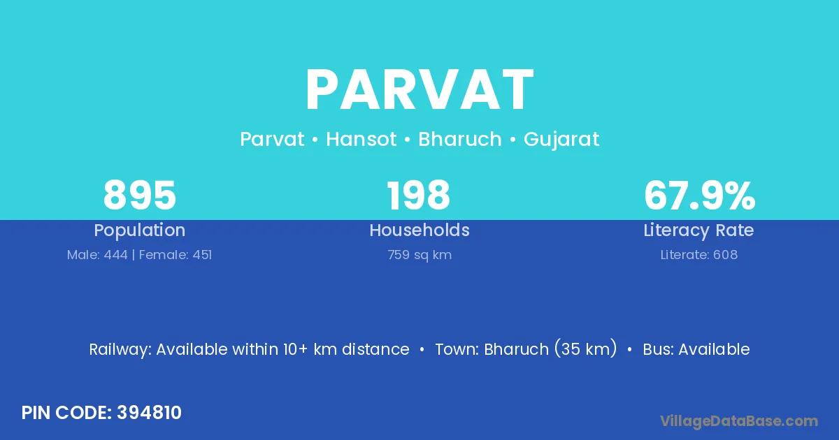 Bharuch (35 km) is the nearest town to Parvat village for major economic activities and is located approximately 35 km away.