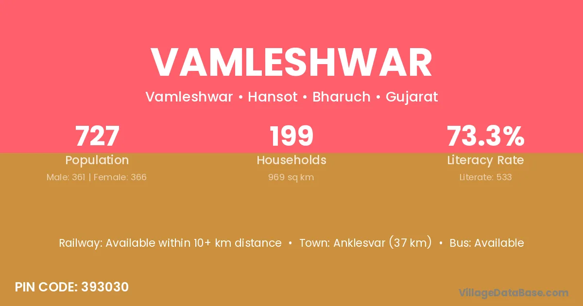 According to Census 2011 information, the village code of Vamleshwar village is 393030.