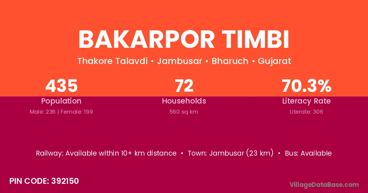 Jambusar (23 km) is the nearest town to Bakarpor Timbi village for major economic activities and is located approximately 23 km away.