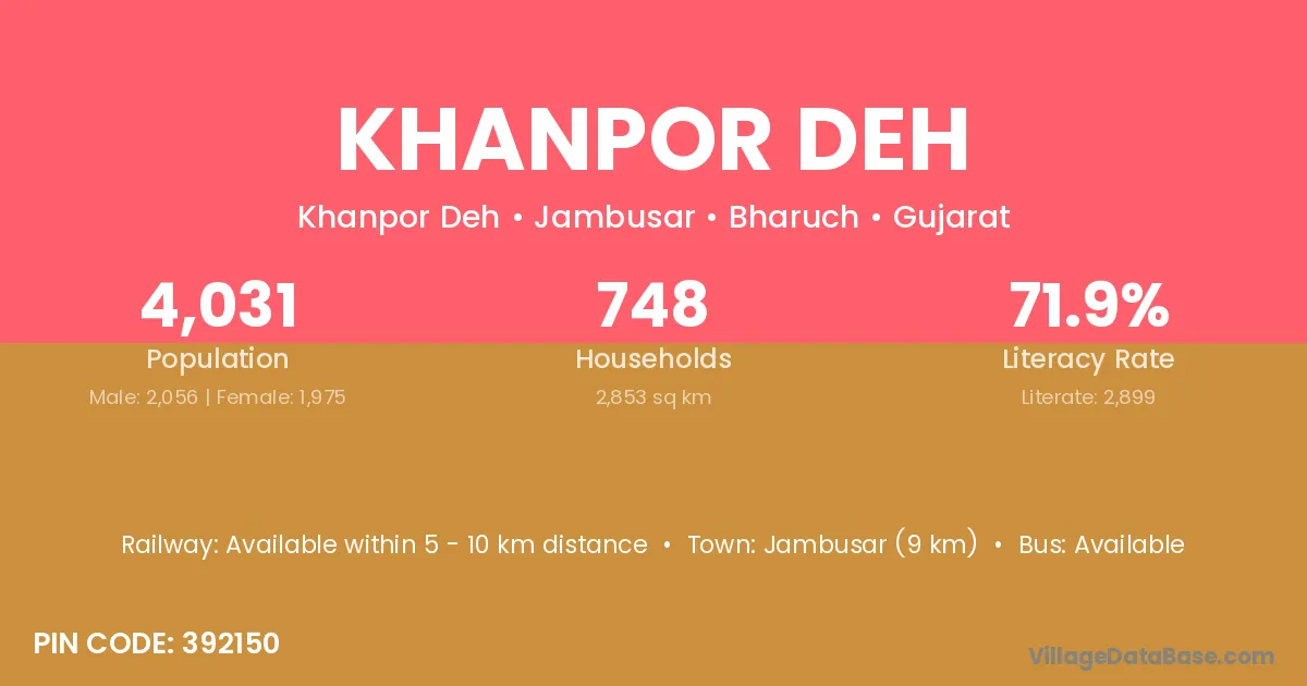 Jambusar (9 km) is the nearest town to Khanpor Deh village for major economic activities and is located approximately 9 km away.
