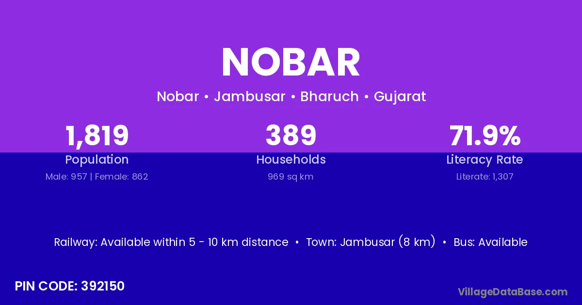 Jambusar (8 km) is the nearest town to Nobar village for major economic activities and is located approximately 8 km away.