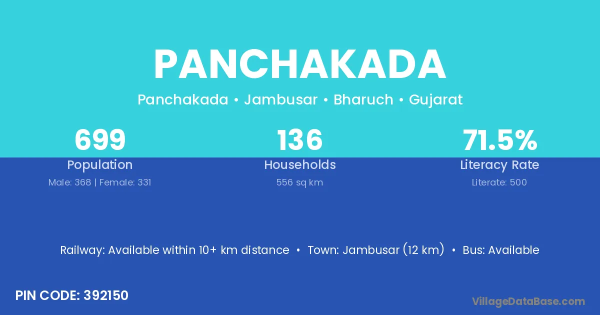 Jambusar (12 km) is the nearest town to Panchakada village for major economic activities and is located approximately 12 km away.