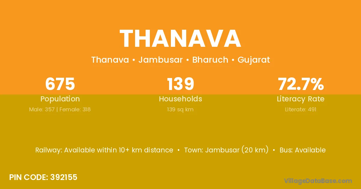 Jambusar (20 km) is the nearest town to Thanava village for major economic activities and is located approximately 20 km away.