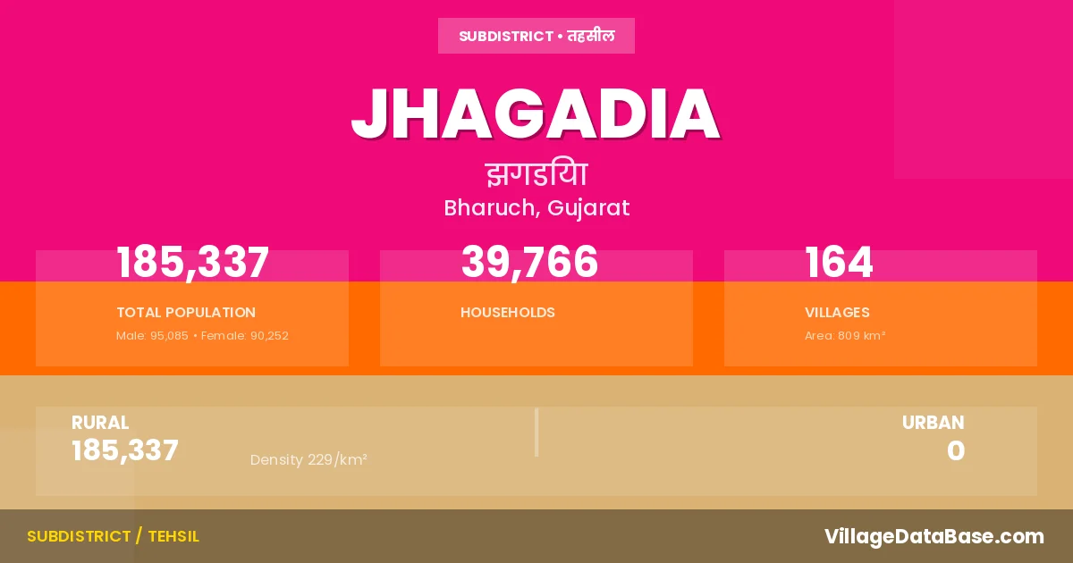 According to the 2011 census The total area of Jhagadia Taluka is 809 km², with a population of 185337 people. The population density is 229 inhabitants per square kilometre, and there are approximately 39766 houses in the sub district.