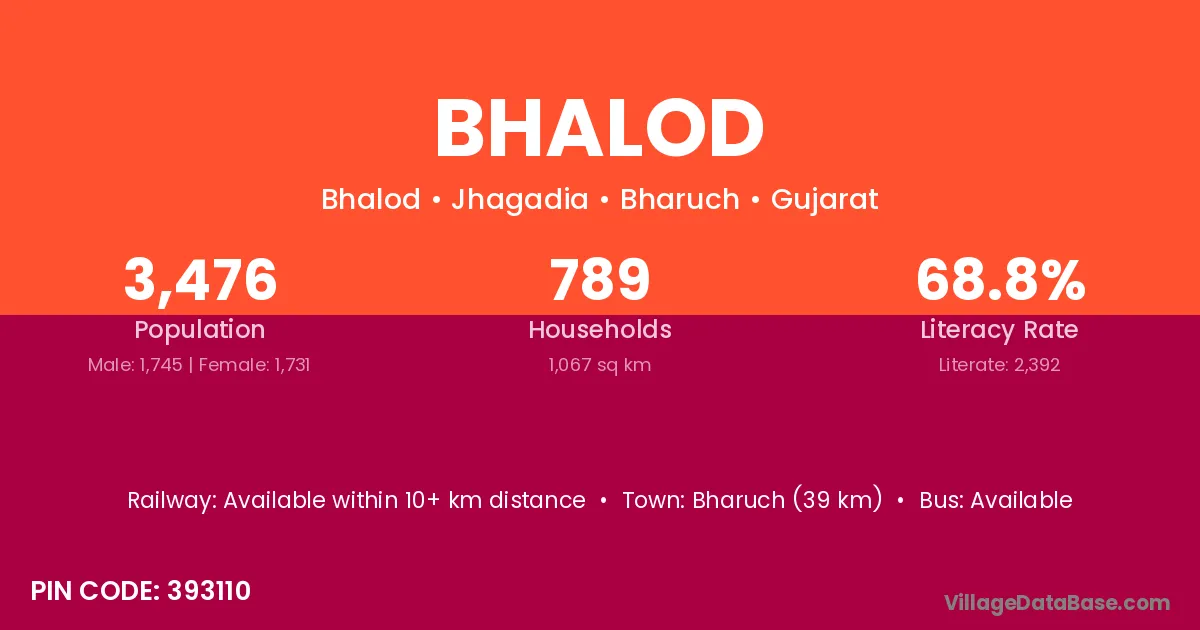 Bharuch (39 km) is the nearest town to Bhalod village for major economic activities and is located approximately 39 km away.
