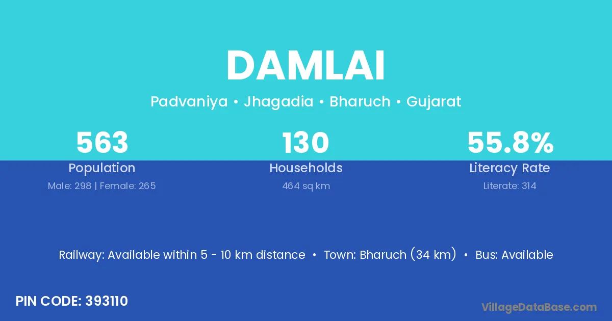 Bharuch (34 km) is the nearest town to Damlai village for major economic activities and is located approximately 34 km away.