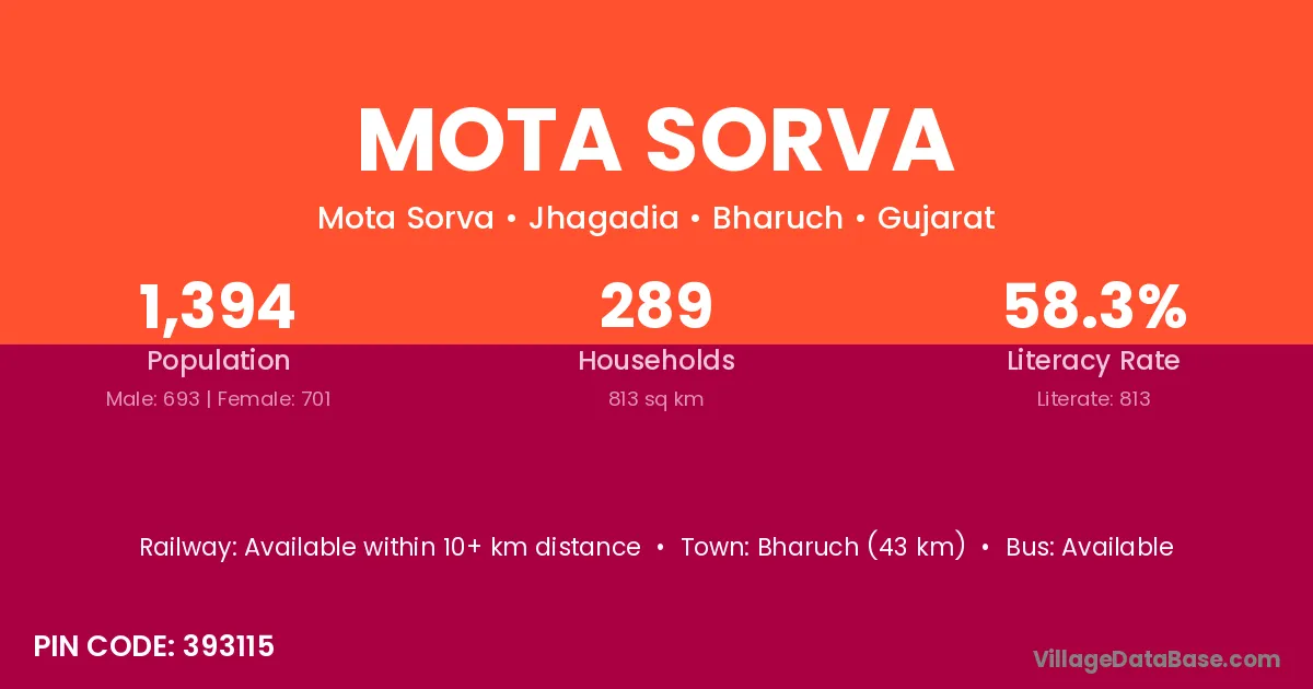 Bharuch (43 km) is the nearest town to Mota Sorva village for major economic activities and is located approximately 43 km away.
