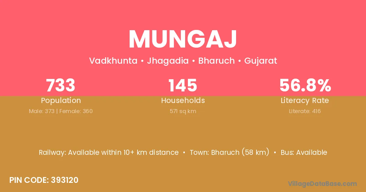 Bharuch (58 km) is the nearest town to Mungaj village for major economic activities and is located approximately 58 km away.