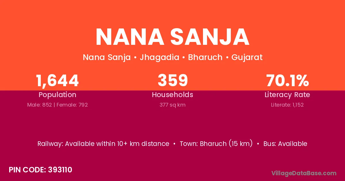 Bharuch (15 km) is the nearest town to Nana Sanja village for major economic activities and is located approximately 15 km away.