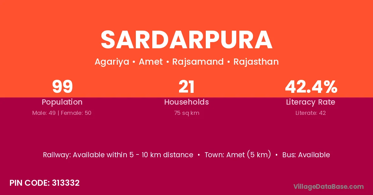 The literacy rate of Sardarpura village is 84.21%. Male literacy stands at 84.21% and female literacy at 84.21%.