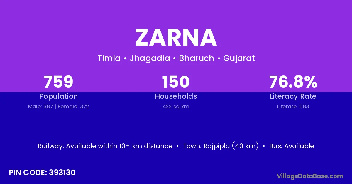 Rajpipla (40 km) is the nearest town to Zarna village for major economic activities and is located approximately 40 km away.